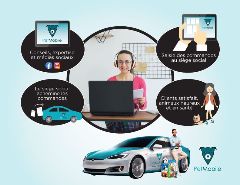 Les concessionnaires PetMobile utilisent différentes méthodes pour trouver de nouveaux clients, dont les médias sociaux pour rencontrer les propriétaires d’animaux domestiques et les différents services offerts sur la plateforme PetMobile notamment, les promeneurs de chiens, le toilettage ainsi que les hébergeurs.
